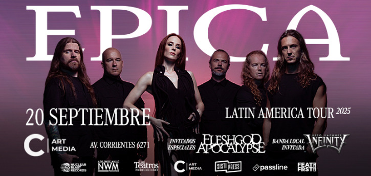 EPICA regresa a Argentina! La visita será el sábado 20 de septiembre 2025 en C Art Media (Avenida Corrientes 6271, CABA), contarán con FLESHGOD APOCALYPSE como invitados especiales y la banda local será Beto Vázquez Infinity.