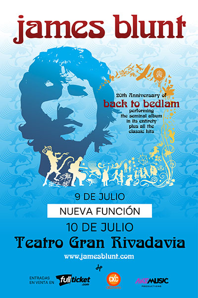 El reconocido músico británico James Blunt llegará a la Argentina para celebrar el aniversario n°20 de su icónico disco “Back to Bedlam” 9 y 10 de Julio en Teatro Gran Rivadavia, Av. Rivadavia 8636 Barrio de Velez Sarsfield Ciudad Autónoma de Buenos Aires.